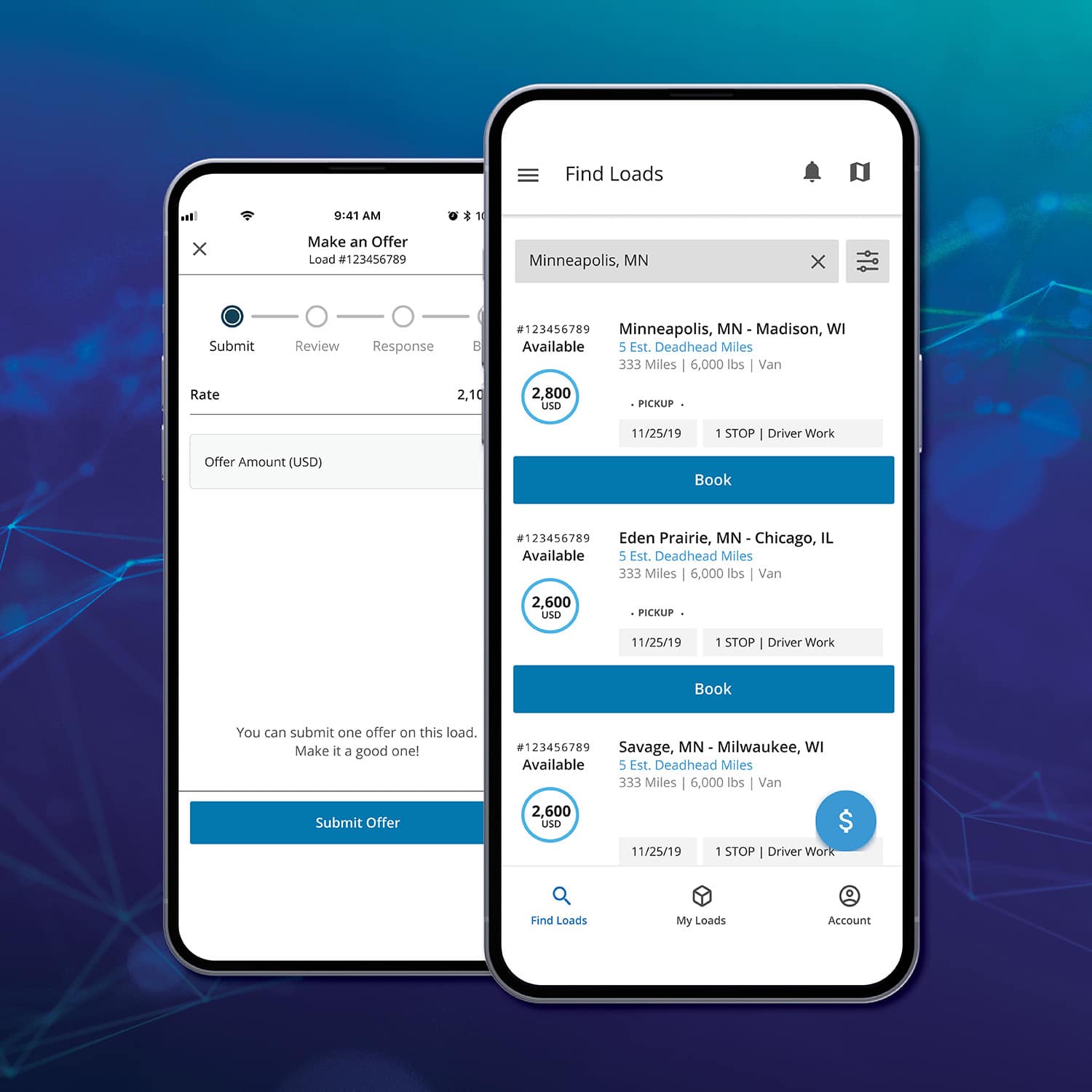 Restez connecté—pour les chargements réservés et disponibles—directement sur votre appareil iPhone® ou Android®. Avec une seule application pour les outils qui vous intéressent, il est facile de connaître votre prochain déplacement.